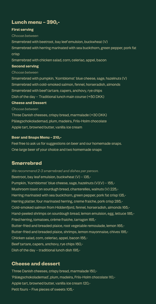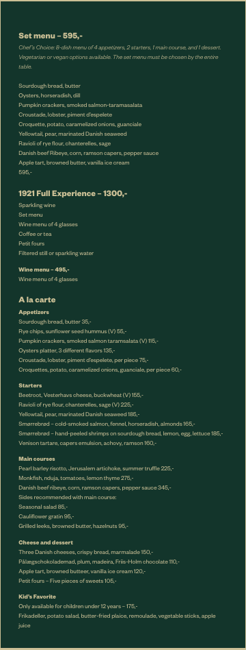 From their iconic smørrebrød, featuring a variety of toppings, to more seasonal dishes that change with the months, each plate is a perfect representation of Denmark’s food culture. The balance of textures and flavors invites you to savor every bite, making it a truly satisfying experience. Whether it's the richness of the smoked salmon or the crispness of pickled vegetables, the menu at Aamanns 1921 is both familiar and exciting, providing a modern take on traditional flavors.